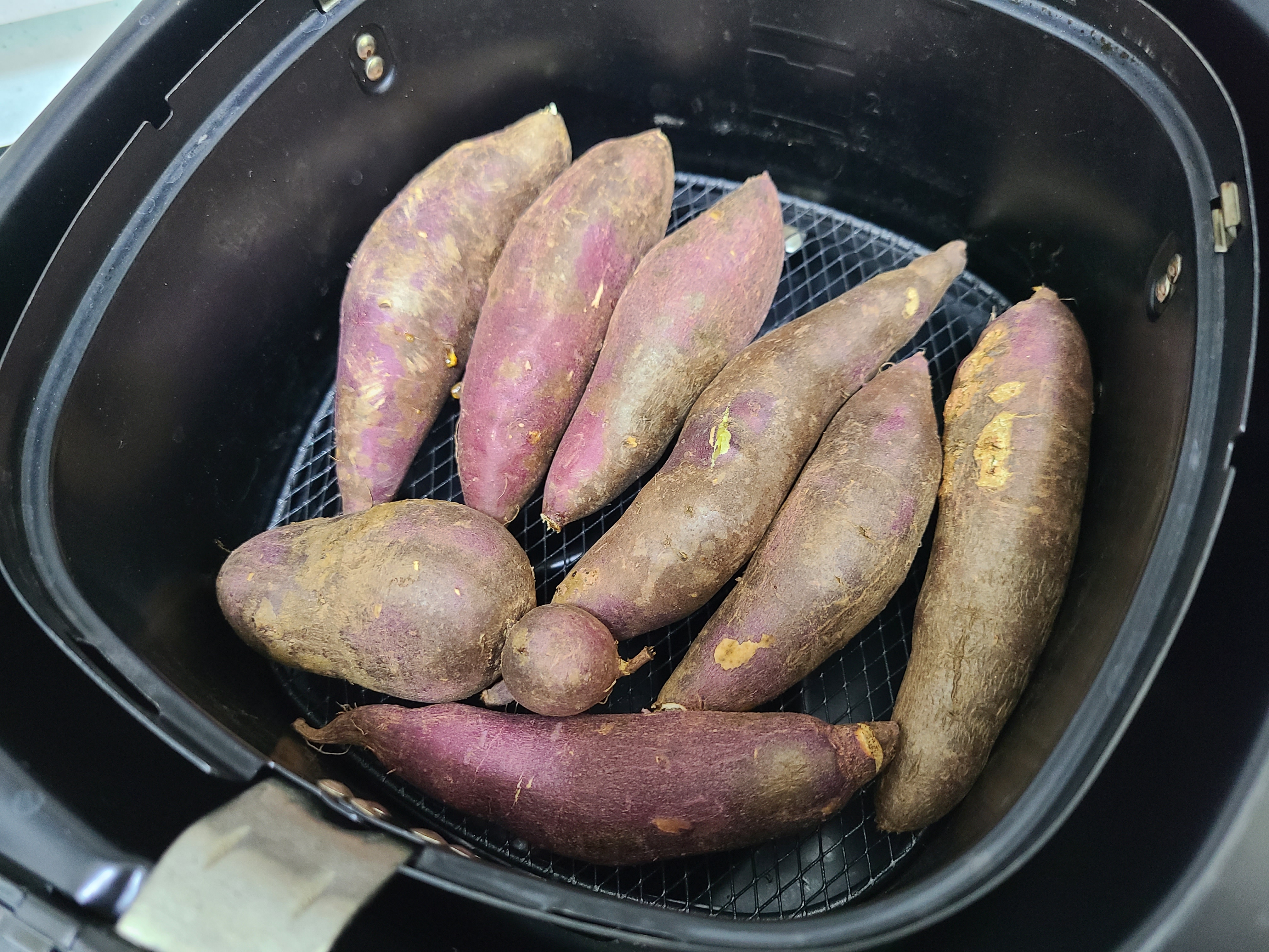 고구마를 무선별로 구입하여 크기가 다양한데 그중 작은 것들로 골라서(개당 70~80g 정도) 에어프라이어에 겹치지 않게 담을 수 있는 만큼 깨끗이 씻어주었다.